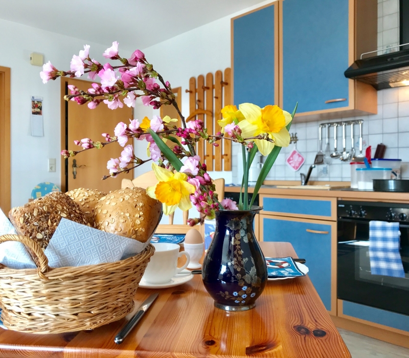 Der ikonisch-blaue Küchenbereich mit sonnigem Blick über die Felder lädt zum Verweilen ein.
